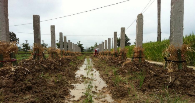 *Khoảng cách mật độ trồng: Hàng cách hàng 2,3-2,4m, trụ cách trụ trên hàng 1,8-2m. với khoảng cách này 1 sào Bắc bộ có thể trôn 80-85 trụ. Cần thiết kế trụ và trôn cột trụ trước khi trồng 7-10 ngày. Kích thước trụ dài 1,8m, thiết diện cắt ngang của trụ có diện tích 13x13cm (trụ được làm bằng bê tông cốt thép phi 10 dài 1,68m, Tỷ lệ Xi măng-Cát-Đá là 1:2:3). Trôn trụ bê tông âm xuống đất 60cm, phần dương 1,2m.