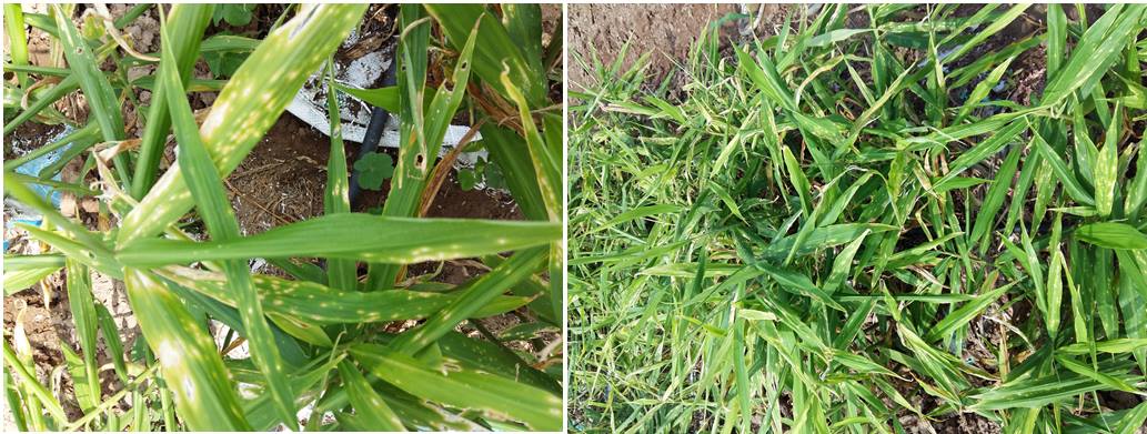 Triệu chứng bệnh cháy lá trên giống gừng trâu, trồng bằng bao. Bệnh do nấm piricularia grisea gây ra