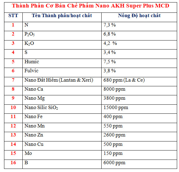 Phần 1: Thành phần cơ bản của chế phẩm nano AKH Super Plus MCD chuyên dùng cho cây mắc ca (thể hiện bảng kê dưới đây)
