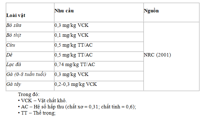 Để đàn gia súc, gia cầm khỏe mạnh, cần bổ sung đủ lượng Se trong khẩu phần thức ăn. Trong điều kiện chăn nuôi công nghiệp, đặc biệt ở những vùng đất thiếu Se. Nhu cầu Se của vật nuôi được Hội đồng nghiên cứu khoa học quốc gia (NRC) tổng kết ở bảng 1. Dung nạp tối đa Se trong khẩu phần thức ăn của phần lớn các loài vật nuôi là 0,2 mg/kg, nhưng còn phụ thuộc vào dạng Se sử dụng là dạng vô cơ hay hữu cơ hay nano selen.