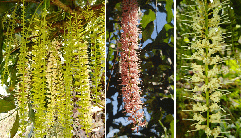 Đặc điểm thực vật học của hoa mắc ca: Hoa tự đuôi sóc mọc ra tại các nách lá trên cành 2-2,5 tuổi, tập trung chủ yếu ở đầu cuối đoạn cành. Mắc ca 3-5 năm tuổi có hoa thường phân hóa tập trung ở những cành nhỏ mang ít nhất từ 2-3 nách lá, đạt tuổi sinh lý. Hoa mắc ca thường mọc thành chùm dạng chuỗi, mỗi hoa dài 15-22cm (tùy dòng và điều kiện chăm sóc, điều kiện khí hậu thổ nhưỡng). Hoa mắc ca lưỡng tính, cánh hoa thoái hoá, mỗi bông có 4 cánh hoa do 4 cánh đài hoa mọc dài ra mà thành, trước khi nở chúng dính liền nhau thành búp dài tròn. Bầu hoa thượng vị chứa 2 phôi châu nhưng thường chỉ 1 phôi phát dục và sau này tạo thành hạt tròn. Nếu cả 2 phôi đều thụ tinh thì quả sẽ chứa 2 hạt hình bán cầu chất lượng thương phẩm sẽ kém. Nhuỵ cái rất dài, trước khi hoa nở vòi nhị cái dài ra rất nhanh, uốn cong và lách ra khỏi búp cánh rồi vươn thẳng, 4 nhị đực đính trên 4 cánh giả và chỉ bật ra được khi hoa đã nở, nhị đực uốn cong xuống phía dưới cách xa đầu nhuỵ cái. Quá trình nở hoa, tung phấn ở mỗi dòng mắc ca là khác nhau do đó khi trồng nên phối hợp nhiều dòng để các cây có thể thụ phấn chéo, nâng cao tệ đậu quả đồng thời làm đa dạng quần thể.