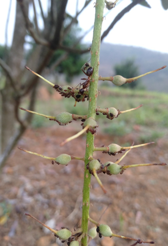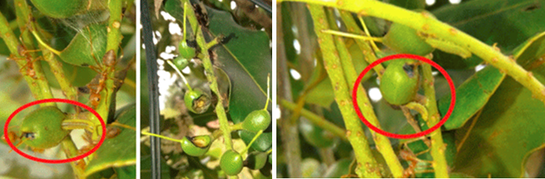 Rệp và Kiến sống cộng sinh, chích hút quả và cuống quả non mắc ca giai đoạn ra hoa đậu quả (gây rụng quả non)