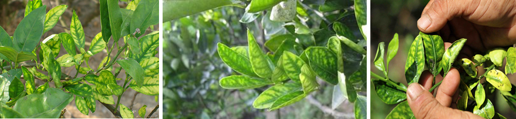 Có thể nói khi cây bị nhiễm bệnh Greening nhìn tổng thể chúng ta thấy hầu hết phần thịt lá chuyển màu vàng trong khi đó phần gân lá vẫn còn màu xanh cho nên người ta gọi là bệnh vàng lá gân xanh (Greening). Triệu chứng ban đầu của bệnh rất dễ bị nhầm lẫn với các bệnh sinh lý về dinh dưỡng, đất thừa ẩm...