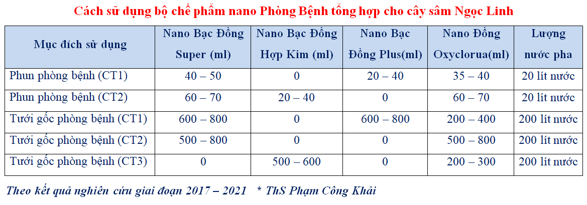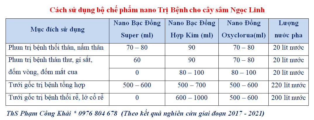 Phun thân lá giai đoạn cây có lá non: Dùng 40ml nano Đồng Oxyclorua kết hợp 40ml nano Bạc Đồng Super cộng thêm 20-30ml nano Bạc Đồng plus pha 20 lít nước, phun định kỳ 7-10 ngày/lần (công thức này có thể áp dụng phun cho cây sâm Ngọc Linh giai đoạn ra hoa, đậu quả, có mưa ẩm).
