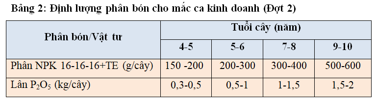 Bón phân bổ sung cho mắc ca đợt 2: Vào tháng 12, tiếp tục triển khai bón phân đợt 2. Mỗi cây bón 150-500g phân NPK 16-16-16 + TE (tùy tuổi cây), kết hợp bón thêm 0,5-1,5kg phân lân Super (tùy tuổi cây và thực trạng sinh trưởng cành lộc tại thời điểm bón. Hoặc có thể bón bổ sung lân super vào thời điểm cây bắt đầu phân hoá mầm hoa sau đó theo nước, giữ ẩm đất liên tục). Kali, lân là cần thiết cho quá trình cây ngủ nghỉ, ủ mầm hoa, giúp mắc ca phân hoá và phát triển mầm hoa khá tốt. Tuy nhiên cần bón phân theo nhu cầu cây, phù hợp với từng giai đoạn phát triển của cây mắc ca. Việc bón phân không cân đối sẽ làm giảm hiệu quả phân bón, tạo ra quan hệ đối kháng dinh dưỡng. Chẳng hạn việc lạm dụng vôi sẽ làm giảm khả năng hấp thụ lân. Bón kali cao sẽ làm giảm hấp thu Bo và Ca,…ảnh hưởng đến sinh trưởng hoa, quả non và tỷ lệ đậu quả.