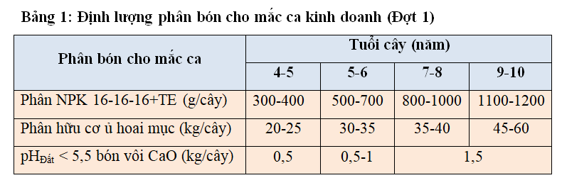 Bảng 3: Phân bón cho mắc ca giai đoạn nuôi quả, phát triển quả