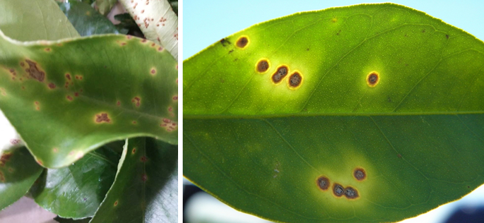 Bệnh loét cam do vi khuẩn Xanthomonas citri gây ra.
