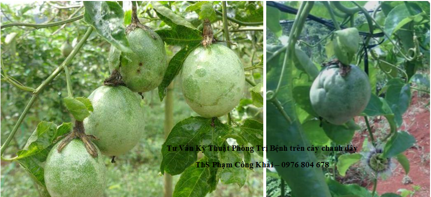 Triệu chứng bệnh phấn trắng virus trên quả chanh dây: bề mặt quả bị bao phủ một lớp phấn trắng nhìn giống vỏ quả bưởi. Bệnh nhẹ vỏ quả thường có màu xanh trắng. Khi bệnh phát triển mạnh quả trở lên khô cứng, hơi teo lại, vỏ quả lồi lõm, bề mặt vỏ quả kém nhẵn bóng hơi thô ráp...