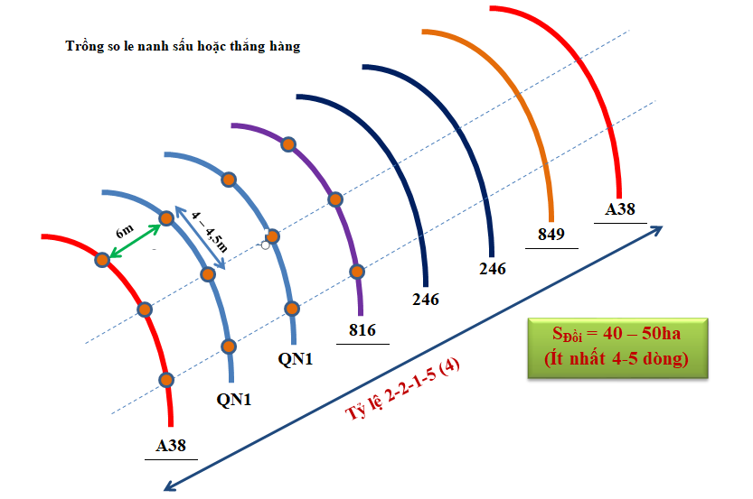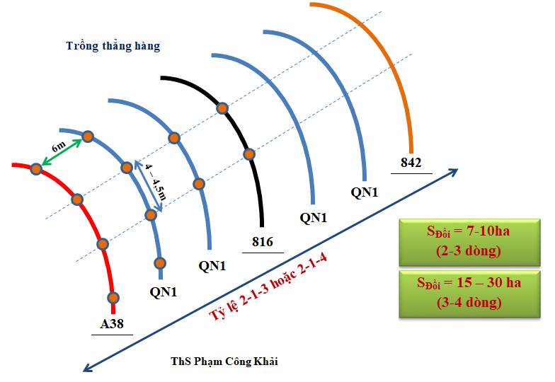 Phương pháp bố trí trồng xen các dòng mắc ca trên cùng một phân khu diện tích: tỷ lệ 2-1-3 hoặc 2-2-1-4 hoặc 2-2-1-5,...