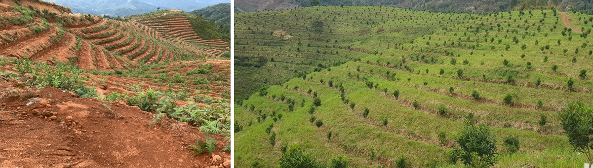 Băng trồng và đường đồng mức: Trên đất dốc, cần phải thiết kế băng trồng sao cho cân đối hợp lý, tạo thành các đường đồng mức thuận lợi cho quá trình trồng và chăm sóc. Khi cắt băng cần phải ổn định kết cấu đất, hạn chế xói hoặc sạt lở băng (không nên sử dụng đất mượn phần mép ngoài băng quá nhiều), chiều rộng mỗi băng 3 – 3,2m, lưu ý không nên để phần taluy dương có độ dốc quá lớn.