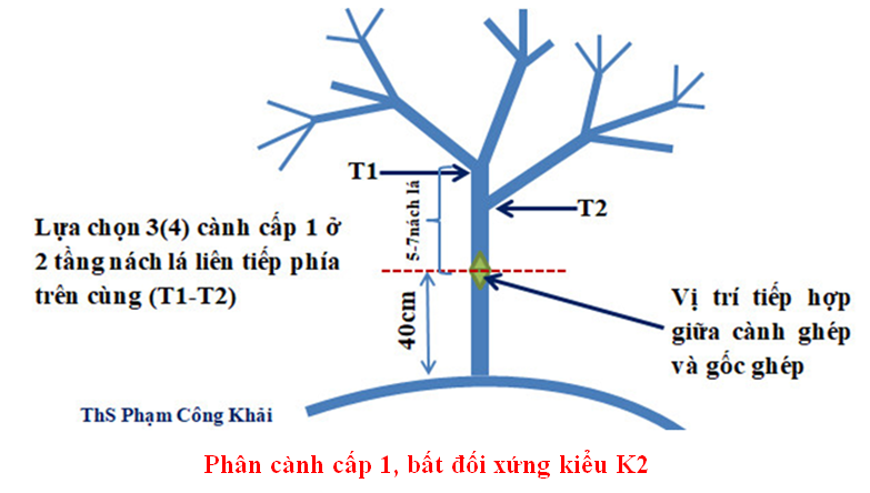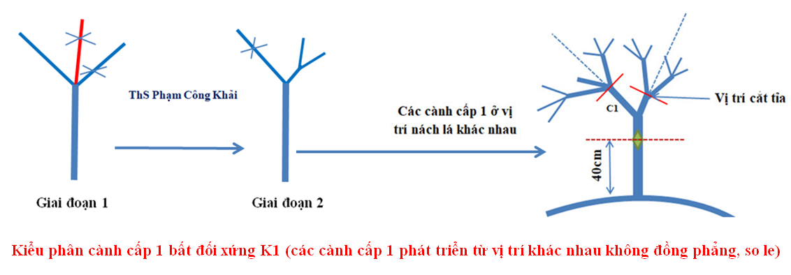 Quá trình cắt tỉa cành, định hình tán phải tiến hành sớm và chủ động đặc biệt ở năm đầu tiên(cây 1 năm tuổi). Trước khi trồng cần bấm ngọn đồng loạt tại vị trí nách lá thứ 5-7, mầm sinh dưỡng phát triển tại vị trí nách lá này chính là các cành cấp 1. Tùy dòng/giống, điều kiện chăm sóc, sâu bệnh hại mà các cành tại vị trí này có thể phát sinh phát triển đồng thời 2-3 hoặc 4 mầm sinh dưỡng (A38).
