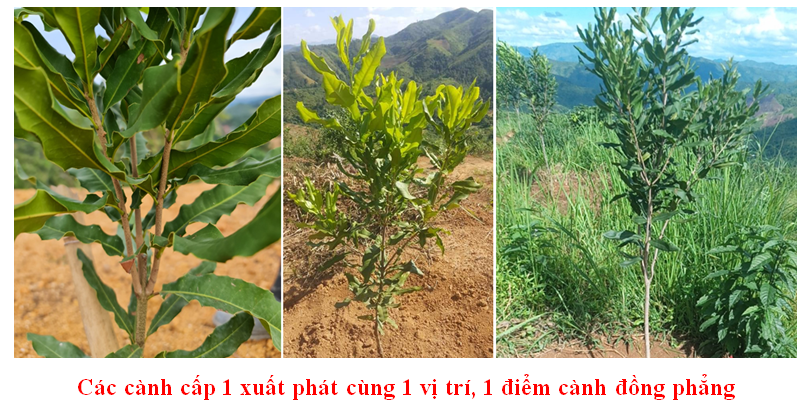 Cần chủ động các biện pháp cắt tỉa, phân cành cấp 1 ngay từ giai đoạn sau trồng, giúp ổn định thế tán cây, chống đổ ngã, gãy/xé cành. Có nhiều kiểu phân cành cấp 1, tùy thuộc vào thực trạng sinh trưởng và phát triển của cây mắc ca, tùy dòng/giống và điều kiện sinh thái từng vùng. Sau đây tôi xin giới thiệu các kiểu phân cành cấp 1 cho cây mắc ca (phân cành đồng trục đối xứng và không đồng trục bất đối xứng – xem hình minh họa dưới đây).