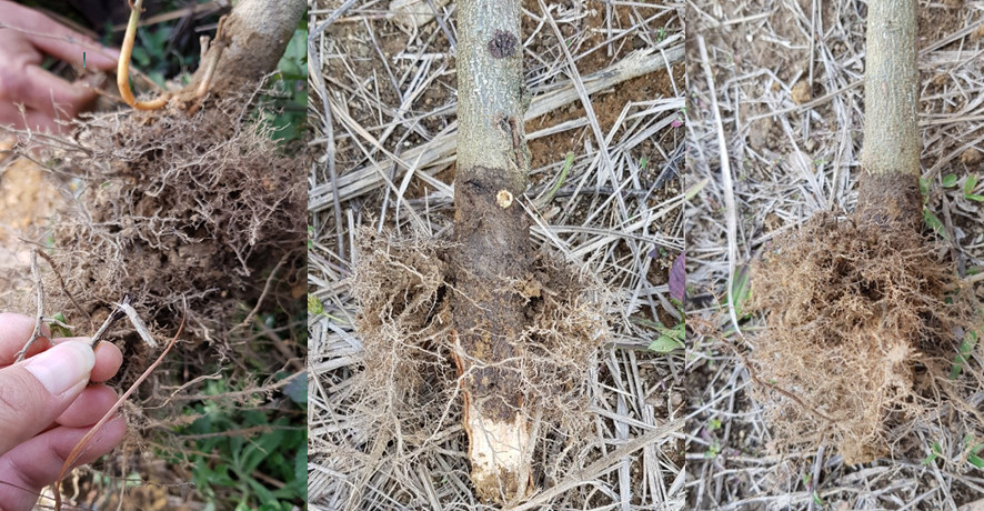 Bộ rễ bị các chủng nấm tấn công (nấm Fusarium spp.,Nấm Pythium sp. và Phytophthora sp.). Nấm bệnh gây thối rễ, vàng lá, hiệu suất hấp thu dinh dưỡng của bộ rễ kém đi (dinh dưỡng nuôi thân lá giảm sút nghiêm trọng, mất cân đối, gây cháy lá, vàng lá tùy mức độ nặng nhẹ của nấm bệnh).