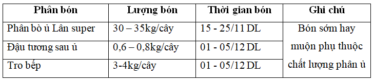 + Đối với phân Bò ủ trộn lân super theo công thức: Dự kiến bón vào khoảng 15-25/11 DL (muộn nhất 05-10/12 DL phải hoàn thành, sớm hay muộn tùy theo chất lượng phân).