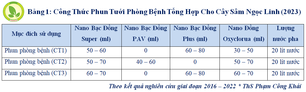 Tưới gốc phòng bệnh cho cây sâm Ngọc Linh (CT5): Dùng 70-80ml nano Bạc Đồng PAV kết hợp 70-80ml nano Đồng oxyclorua cộng thêm 70-80ml nano Bạc Đồng Super pha với 20 lít nước tưới ẩm gốc, tưới định kỳ 10-15-20 ngày/lần (tuỳ điều kiện thời tiết, thời điểm cây dễ nhiễm bệnh nên tưới 7-10 ngày/lần).
