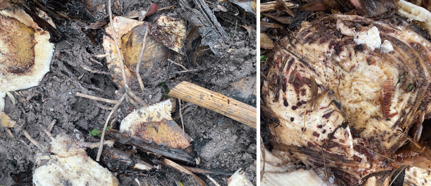 + Lá bị bệnh thường héo vàng, cuống gãy tại nách lá, lá treo trên thân giả, đôi khi cuống lá cũng bị gãy ở phần giữa phiến lá.