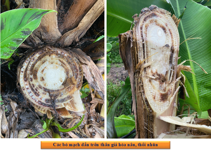 + Triệu chứng trên thân giả và thân chính: về cơ bản cây chuối nhiễm bệnh vàng lá panama thường bị chết nhưng thân không đổ, các bẹ ngoài bị nứt dọc. Cắt ngang các bẹ lá (thân giả) sẽ thấy các bó mạch dẫn hóa nâu vàng, nâu đen. Cắt ngang củ chuối (thân chính) có các đốm màu vàng hoặc đỏ nâu và bốc mùi hôi nhớt.