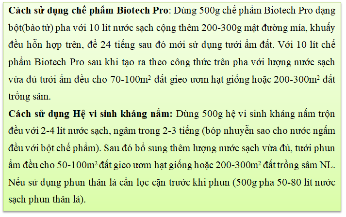 Dùng 500g hệ vi sinh kháng nấm trộn đều với 2-4 lít nước sạch, ngâm trong 2-3 tiếng (bóp nhuyễn sao cho nước ngấm đều với bột chế phẩm). Sau đó bổ sung thêm lượng nước sạch vừa đủ, tưới ẩm đều cho 50-100m2 đất gieo ươm hạt giống hoặc 200-300m2 đất trồng sâm Ngọc Linh.