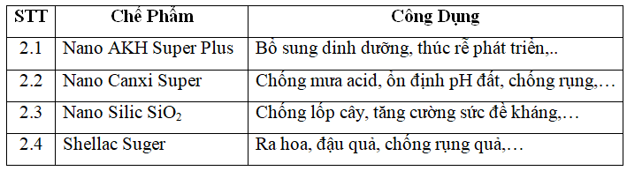 Ngoài ra dùng nano AKH Super Plus, nano Silic SiO2, nano Canxi Super tưới ẩm xen kẽ thúc bộ rễ phục hồi và phát triển, duy trì sức sinh trưởng của cây (liều lượng như phần 2 hướng dẫn). Ở các giai đoạn sau đó, sử dụng chế phẩm Biotech Pro và Hệ vi sinh kháng nấm tưới luân phiên, cách nhau 10-15 ngày.