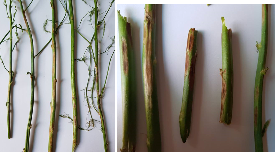 Triệu trứng bệnh thán thư trên măng tây: Bệnh thán thư biểu hiện chủ yếu trên thân từ phía gốc (cách khoảng 20cm) trở lên phía trên. Bệnh thán thư có thể gây hại trên măng tây sau 1,5-2,5 tháng trồng(trong điều kiện mưa nắng xen kẽ). Trên thân vết bệnh nằm rải rác dọc thân, vết bệnh có hình dạng bầu dục dài nằm dọc thân, vết bệnh có kích thước to nhỏ khác nhau dao động từ 0,5-1,5-3cm. Bệnh nặng các vết bệnh có thể liên kết với nhau. Vết bệnh thường có màu nâu nhạt đến nâu sẫm, các vết bệnh trên thân có xu hướng lõm xuống. Tại chỗ bị nhiễm bệnh cắt ngang thân cây bên trong các bó mạch dẫn vẫn bình thường (phân biệt với bệnh do vi khuẩn, gây thối đen bó mạch dẫn). Trong khi thân bị nhiễm bệnh thán thư thì tán lá phía trên vẫn có màu xanh (do mạch dẫn vẫn hoạt động).