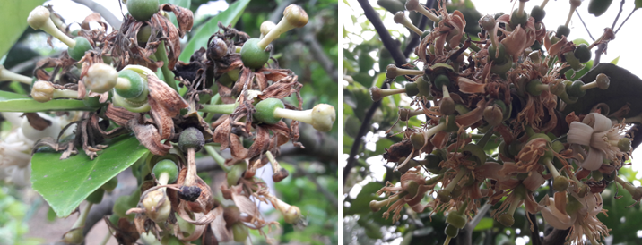+ Do Mưa axít, mưa ẩm kéo dài gây lỏng cuống, cháy hoa và vỏ quả non: Thời kỳ này nếu mưa ẩm kéo dài, nấm khuẩn phát triển mạnh sẽ làm cho chùm hoa rụng hàng loạt(quả non bị đen vỏ). Do đó bà con cần phun chế phẩm nano canxi cacbonat và nano canxi super(chống teo cuống, chống rụng quả).