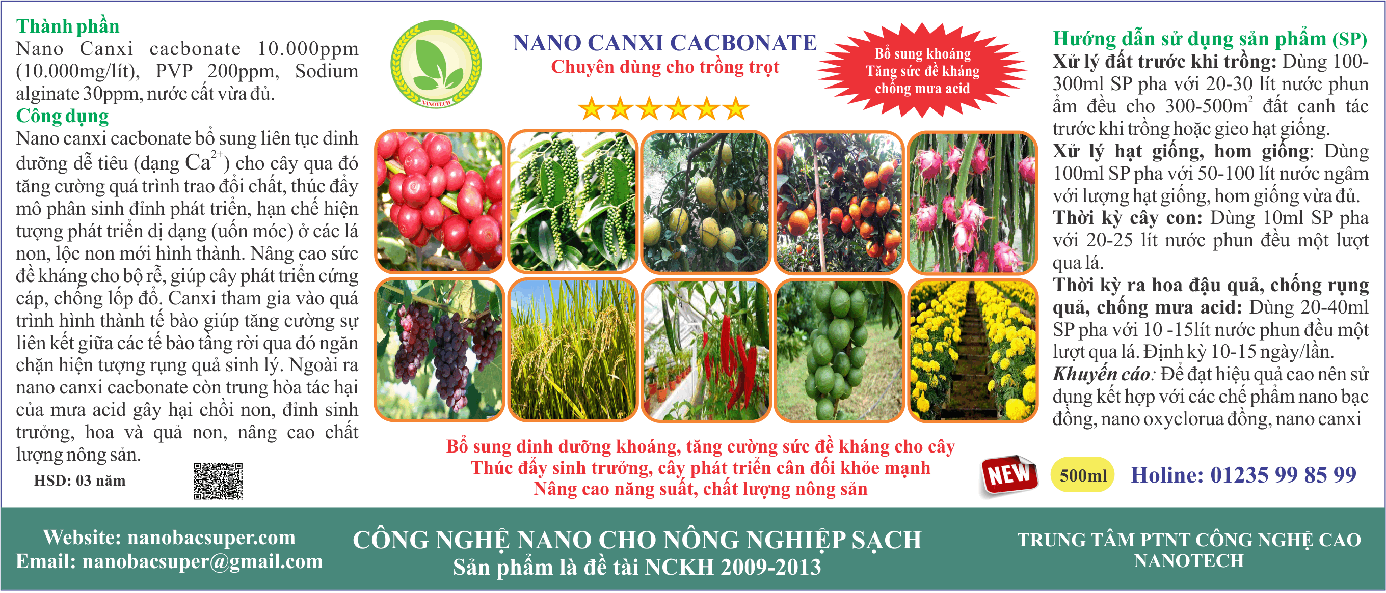 Chế phẩm có chứa Nano canxi cacbonat ở nồng độ cao, sử dụng phun qua lá cho cây trồng theo các thời kỳ sinh trưởng phát triển của cây