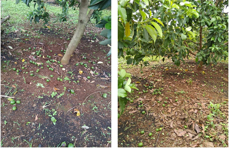 Tác hại thứ nhất: Thúc đẩy quá trình phát sinh, phát triển nấm khuẩn gây bệnh hại cuống và bề mặt trái non gây rụng trái non (khi trái bằng hạt đậu xanh)