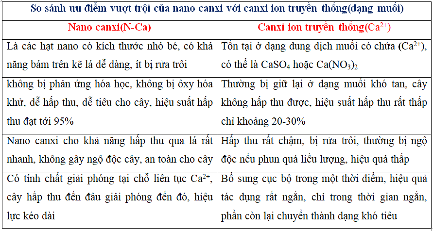 Các dạng canxi truyền thống(không phải nano) khi phun qua lá thường có phản ứng trao đổi với CO32- tạo ra CaCO3 (là dạng Canxi kết tủa khó tan ngay tại bề mặt lá):