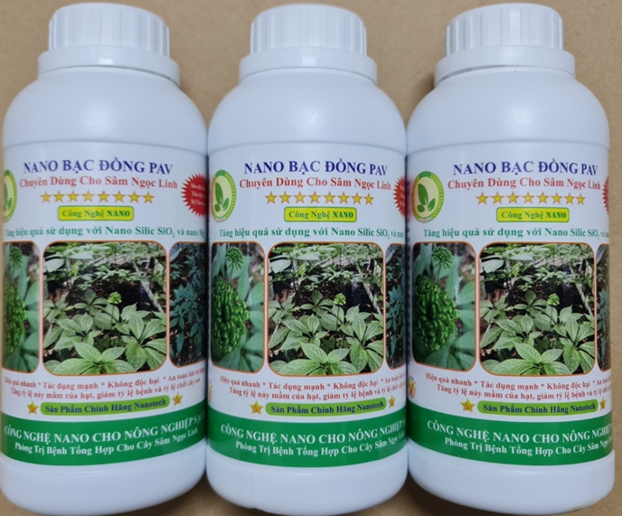 Phòng trị bệnh thối rễ, lở cổ rễ, chết rạp cây con sau khi gieo hạt sâm Ngọc Linh: Trước thời điểm hạt mọc mầm khỏi mặt đất từ 15-20 ngày, dùng 60-80ml nano Bạc Đồng PAV kết hợp 60-80ml nano Đồng Oxyclorua + 60-80ml nano Bạc Đồng Super pha 20 lít nước phun tưới ẩm toàn bộ bề mặt luống, xử lý 2 lần liên tiếp, cách nhau 7-10 ngày/lần.