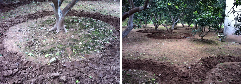 Sau khi làm sạch cỏ dại, xử lý đất, cuốc xới theo hình chiếu tán của cây bà con nên bón vôi bột nếu đất chua (tùy chất đất, tuổi cây bón từ 0,5-1,5-3kg/gốc). Lưu ý không nên bón lân và vôi cùng lúc vì chúng sẽ bị kết tủa dạng muối canxi phốt phát khó tan làm chai đất. Sau khi cuốc xới xung quanh gốc không bón phân và lấp đất ngay mà nên phơi khô, xiết nước từ 10-20 ngày (tùy điều kiện thời tiết và sức sinh trưởng của cây).