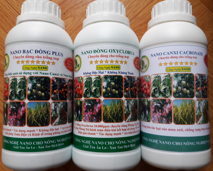 + Chế phẩm nano bạc đồng plus và nano đồng oxyclorua: phòng và đặc trị các nhóm bệnh do nấm, vi khuẩn và virus gây hại bộ lá, hoa và quả non. Sản phẩm không độc hại, không có tác dụng phụ ngay cả khi phun quá liều lượng, các dòng chế phẩm nano trị bệnh không gây tồn dư các chất độc hại và rất phù hợp cho các nhóm cây ăn quả thời kỳ ra hoa đậu quả non(thường mẫn cảm bệnh do nấm khuẩn).