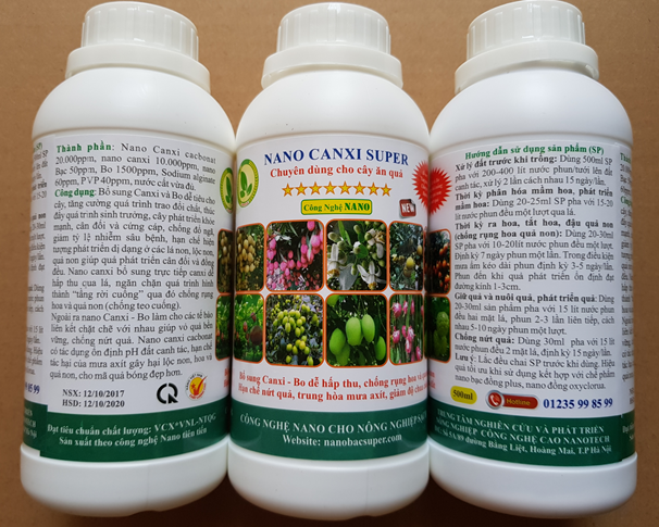 Dùng 500ml nano Canxi super kết hợp 200-300ml Shellac suger pha với 400 lít nước phun đều lên tán lá. Tác dụng nâng cao tỷ lệ thụ phấn, tăng tỷ lệ đậu quả, hạn chế rụng quả non sinh lý.