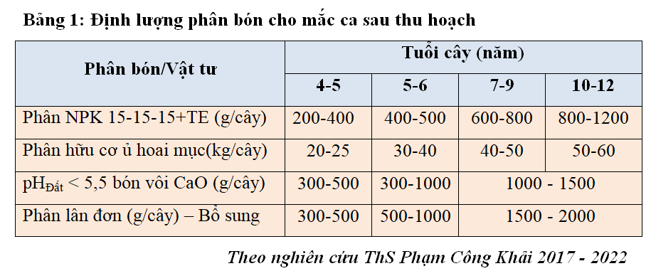 Phân bón cho mắc ca sau thu hoạch như sau: