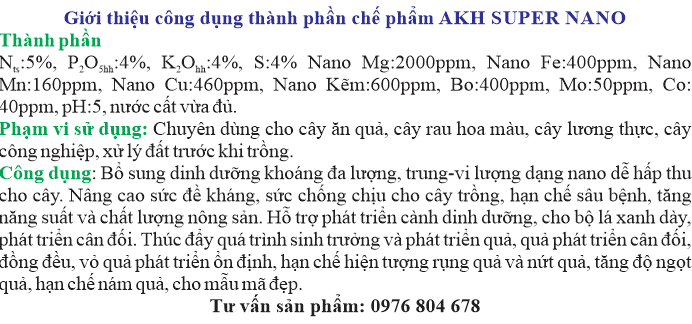 Sự kết hợp phun qua lá nano AKH SUPER, Nano canxi, nano bạc đồng plus, nano đồng oxyclorua phun định kỳ qua lá giúp quả phát triển đều, ổn định, chống rụng quả và nứt quả, đặc biệt chế phẩm nano bạc đồng plus, nano đồng oxyclorua giúp hạn chế tối đa bệnh thán thư, sương mai do nấm, chống đen nám vỏ quả, cho chất lượng quả cao.