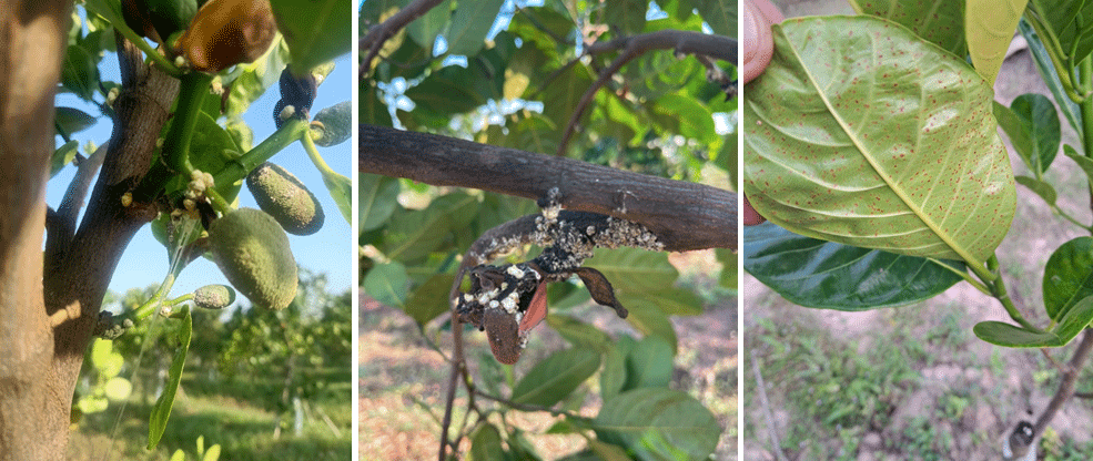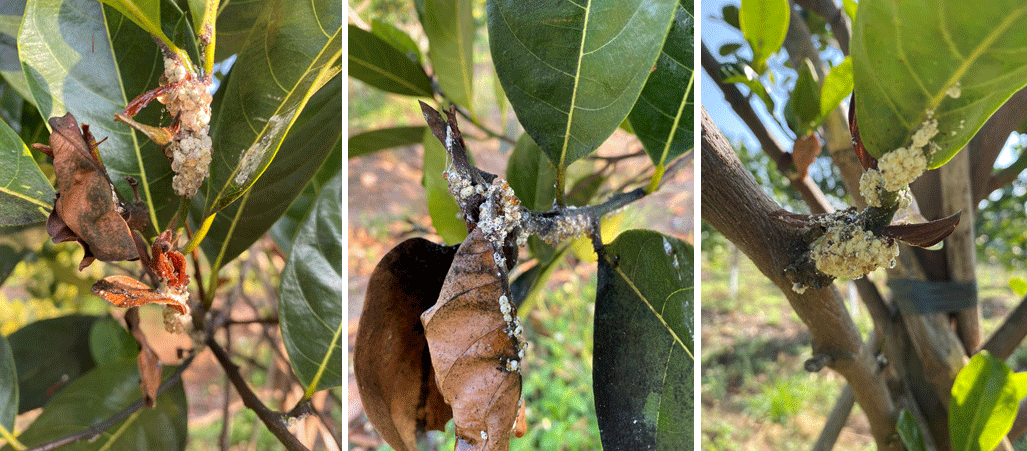 Rệp, rầy: Thời kỳ trước ra hoa, hoa thụ phấn, đậu trái non rệp, rầy phát triển khá mạnh, chúng bám chắc trên thân cành và phát triển lây lan nhanh nếu không có biện pháp phòng trừ (rầy rệp có khả kháng thuốc rất mạnh). Tác hại cơ bản của nhóm côn trùng chích hút (rầy, rệp): chích hút nhựa cây (các bộ phận còn non: đọt non, lá non), tấn công trên trái non làm cho trái dị dạng, phát triển chậm. Nguy hiểm hơn trong quá trình phát triển, chúng tiết ra các acid hữu cơ thu hút loài nấm bồ hóng đen trên lá, trái non làm giảm khả năng quang hợp, qua đó giảm năng suất chất lượng quả.