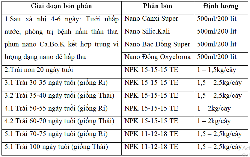 Sau xả nhị 40 ngày: bón gốc NPK 15-15-15 (1,5-2,5kg/cây) kết hợp phun nano Canxi Super, nano Bạc Đồng Super và nano Đồng Oxyclorua. Giai đoạn này chú ý nếu trái nhiều có thể đi đạm cao, trái ít và vừa thì đi phân 3 số NPK.