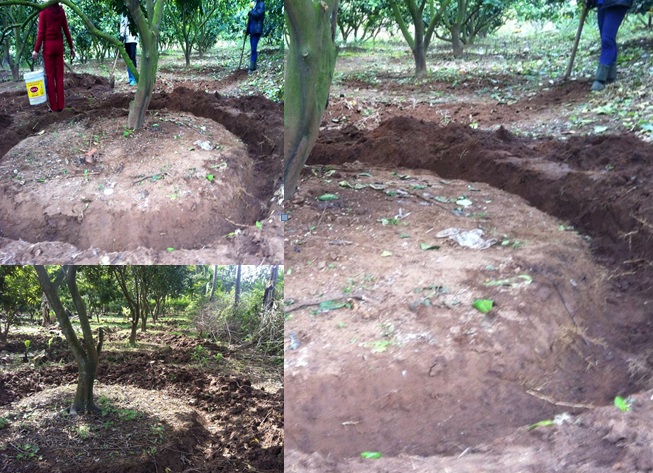Biện pháp 1: Xới đất xung quanh rễ, theo hình chiếu tán của cây với độ sâu 20-25cm, rộng 30-35cm (tùy chất đất và tuổi cây có thể làm sâu rộng hoặc thu hẹp so với kích thước trên). Mục đích của biện pháp này là làm đứt bộ rễ non ngoài cùng hạn chế khả năng hút dinh dưỡng từ đất lên trên, tránh phát lộc đông. Nếu thấy nhiều rễ cọc phát triển có thể chặt (làm đứt rễ) một trong số các rễ cọc của cây. Ngoài ra việc chặt rễ còn có vai trò trẻ hóa bộ rễ cho năm sau, giúp quả phát triển đồng đều, trắc quả.