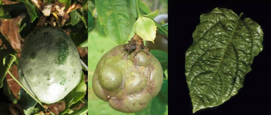 Triệu chứng bệnh do virus hại chanh leo: biểu hiện dễ nhận thấy nhất là quả phát triển dị dạng bất thường, trên bề mặt trái có nhiều khối u to nhỏ nhô lên, vỏ trái cứng lại và hóa bần. Lá bị quăn lại, diện tích lá bị thu nhỏ, lá vàng ở chóp. Thân dây phình to.