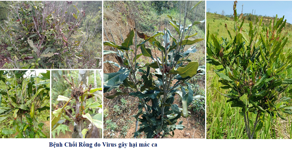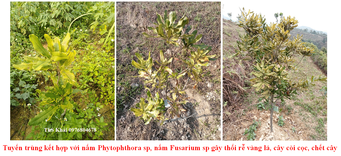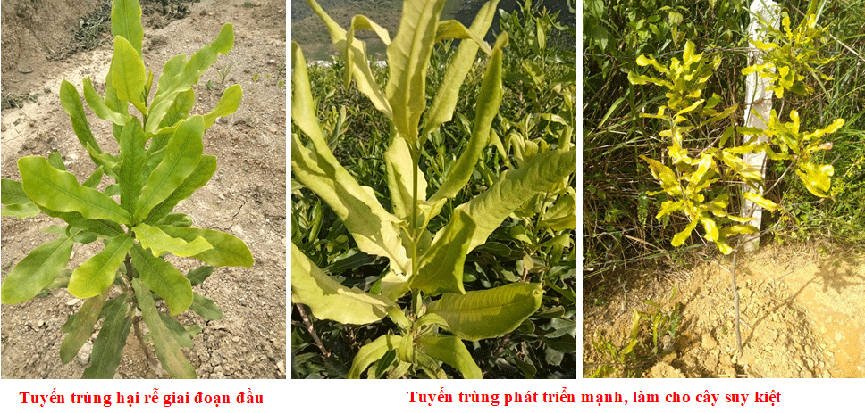 + Cây mắc ca còi cọc, chậm phát triển, lá bị vàng, thân khô, phát triển cong queo, rễ bị nghẹt, thối, bộ rễ hầu như không phát triển, nhiều trường hợp phát hiện của tuyến trùng hại rễ. Ở giai đoạn đầu sau trồng 1-1,5 tháng một số diện tích mắc ca có thể bị ấu trùng sâu non của bọ hung cắn rễ, gây hiện tượng chết rút cây mắc ca, lá héo xanh, đọt bị héo đột ngột (thường bị trên nhưng diện tích bón lót phân hữu cơ không đảm bảo kỹ thuật, phân chưa hoai mục hoàn toàn).