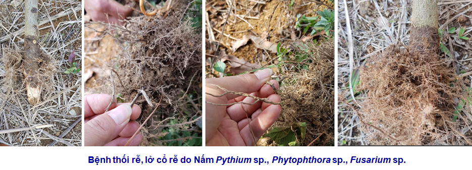 Thứ tư: Do thiếu nước hoặc thừa nước, thoát nước kém vào mùa mưa, bộ rễ bị nghẹt và yếm khó, rễ hầu như không phát triển cộng thêm sự tấn công của nấm phytophthora, Fusarium và tuyến trùng khiến cho cây còi cọc, chậm phát triển, vàng lá, thân chính nhỏ yếu, đọt non không phát triển hoặc nếu có phát triển thì nhỏ yếu, không thoát cành.