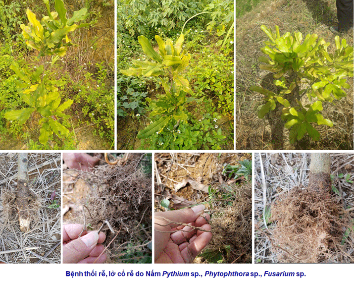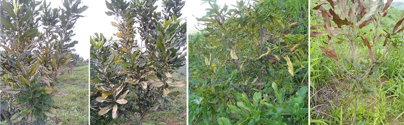 Một số biểu hiện bệnh lý của cây mắc ca (vàng khô lá, thối rễ, lở cổ rễ):