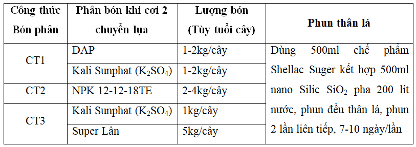 Song song với việc bón phân gốc, kết hợp phun thân lá chế phẩm Shellac Suger và nano Silic SiO2 (giúp bộ lá thành thục nhanh, bổ sung trung vi lượng dạng nano dễ hấp thu giúp cây khỏe, chống chịu tốt với các điều kiện bất lợi của tự nhiên như nóng, khô): Dùng 500ml chế phẩm Shellac Suger kết hợp 500ml nano Silic SiO2 pha 200 lít nước phun đều thân lá, phun 2 lần, cách nhau 7 – 10 ngày/lần. Ngoài ra có thể phun bổ sung MPK với liều lượng 1,5-2kg/200 lít nước (để cơi 2 thành thục nhanh nên phun 2 lần Shellac Suger, nano Silic kết hợp với 1 lần MPK).