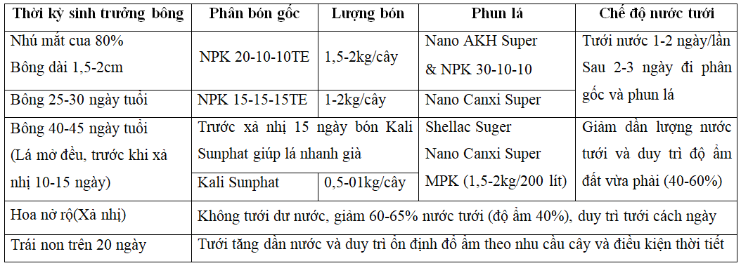 Thứ tư: Kéo cơi lá kịp thời phát triển cùng nụ hoa, không được chậm trễ (cơi lá phát triển kịp theo bông, đảm bảo lá chuyển lụa trước 4-6 ngày khi xả nhị). Nếu đọt ra chậm hơn, chúng sẽ cạnh tranh dinh dưỡng với hoa, gây rụng trái non. Do đó ở giai đoạn nụ hoa nhú 1,5-2cm, tưới nước 2-3 cữ sau đó mới đi phân gốc và lá(Bảng 2).