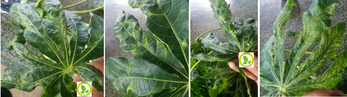 Hình ảnh triệu chứng bệnh khảm virus trên cây khoai mỳ (khảm vàng lá, lá biến dạng, co nhăn)