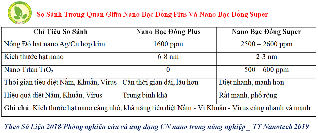 Nano hợp kim bạc đồng có hiệu lực diệt nấm khuẩn sâu rộng hơn nano bạc, trong điều kiện tự nhiên nano bạc đồng ít bị oxi hóa hơn so với nano bạc. Trong khi đó nano bạc có phổ diệt nấm khuẩn rất hẹp, chỉ tiêu diệt được một số chủng vi khuẩn có thành tế bào mỏng. Do đó nano bạc đồng được xem như là một loại chế phẩm chuyên dùng đặc trị bệnh do nấm, vi khuẩn và virus gây bệnh hại cây trồng.